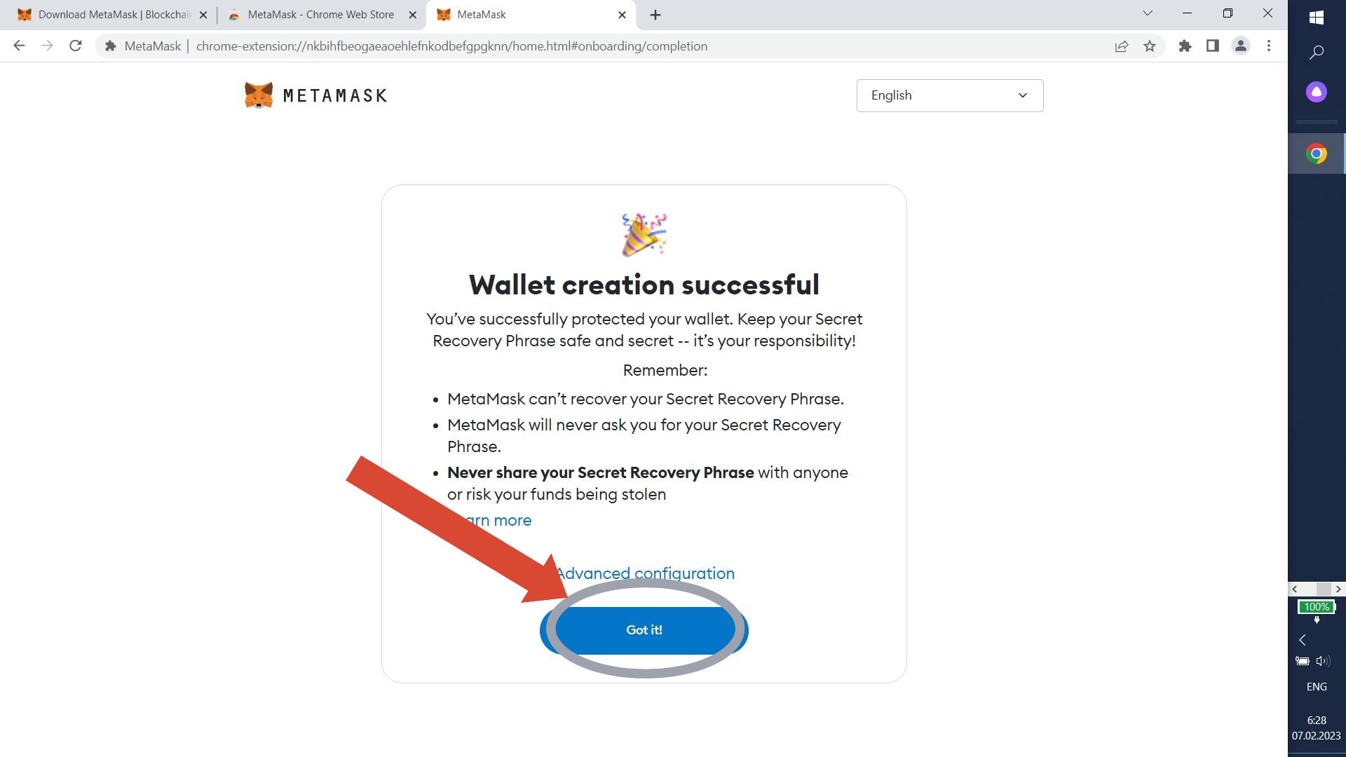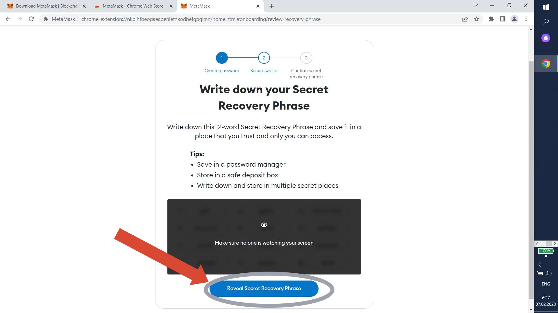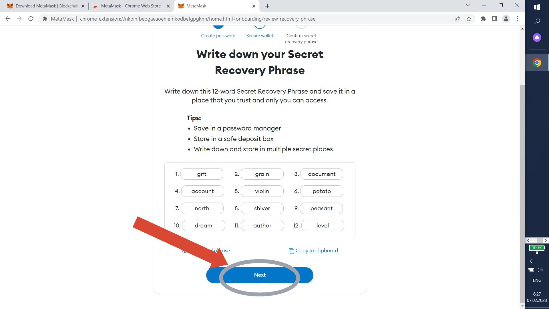 Your secret phrase will show up. Write it down and click "Next".
