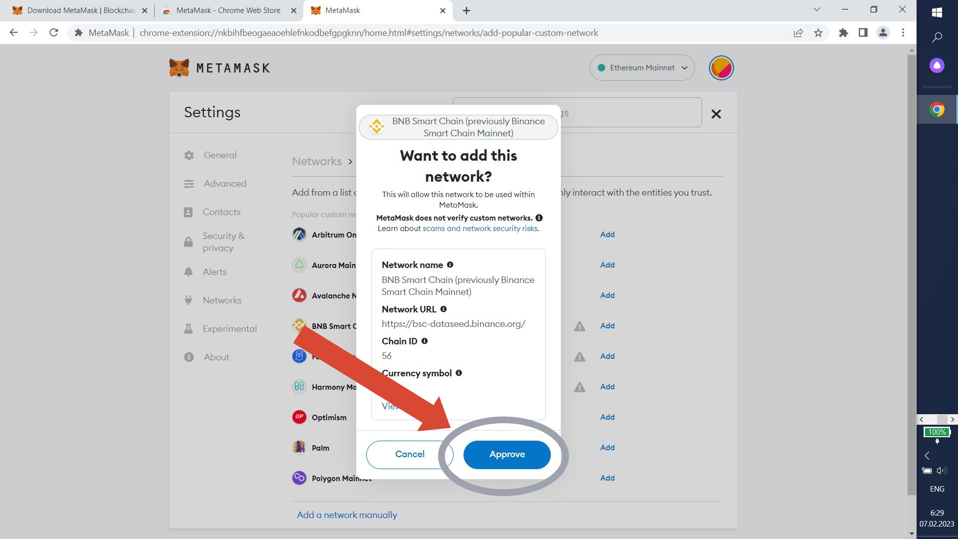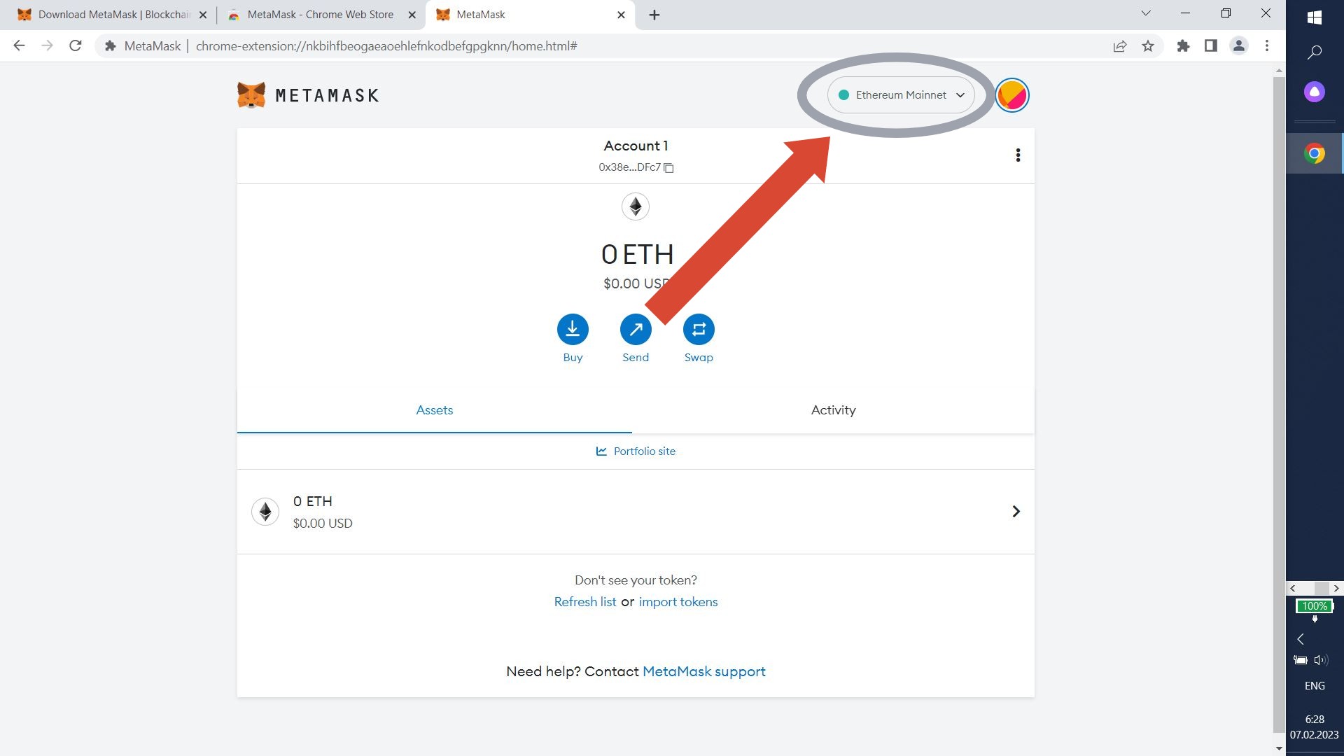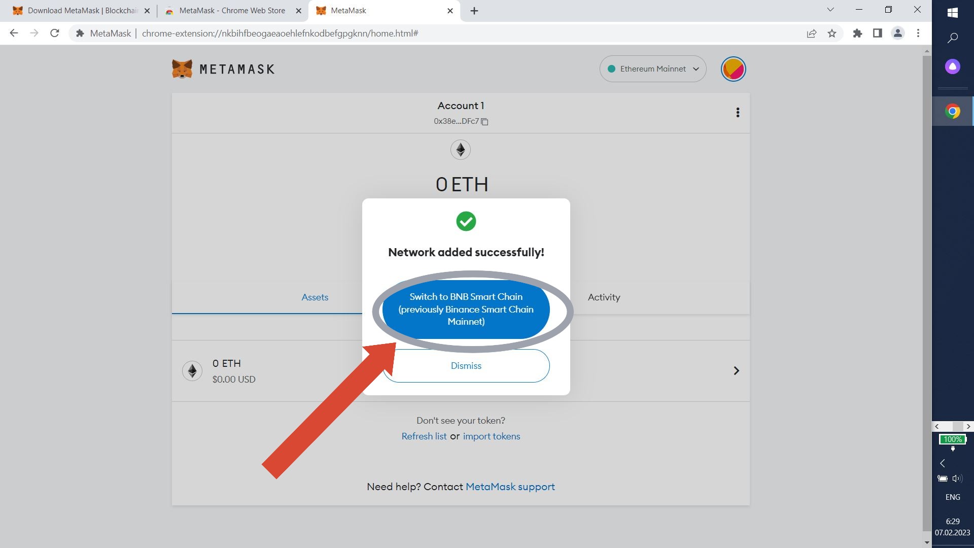 Great! Now you have a wallet. Now you should add BNB Smart Chain. Click "Ethereum Mainnet" in the upper left corner.