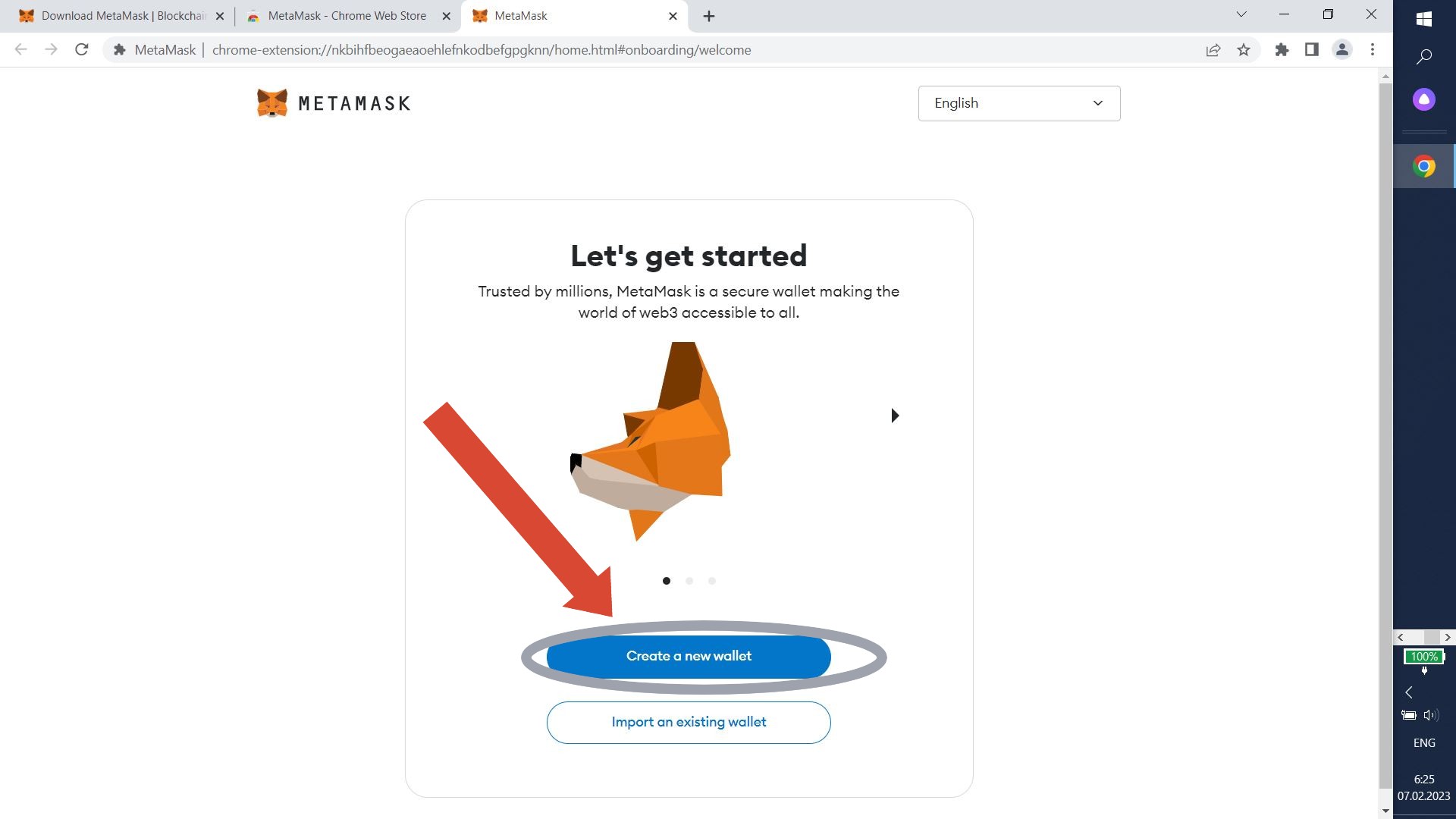 MetaMask opens. Pin the extension if neccesary. Click "Create a new wallet".