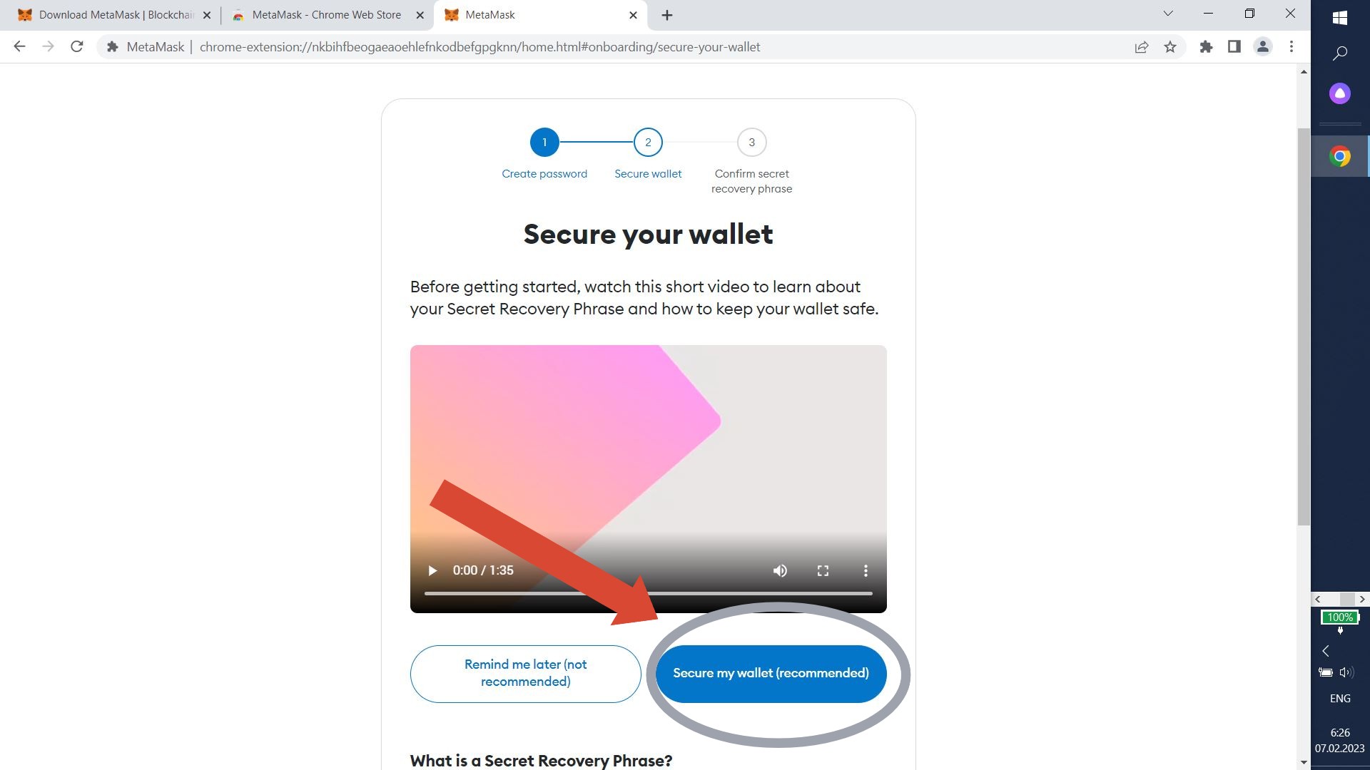 Let's create a secret recovery phrase to protect your wallet. Click "Secure my wallet".
