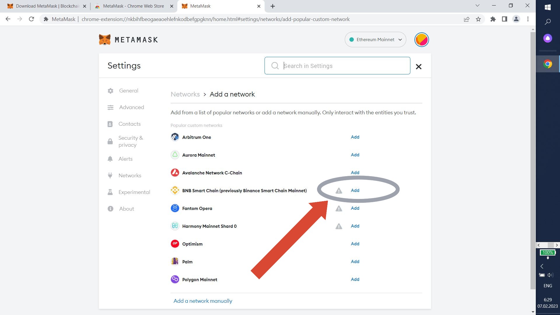 Find BNB Smart Chain in the list of networks and click the "Add" button.