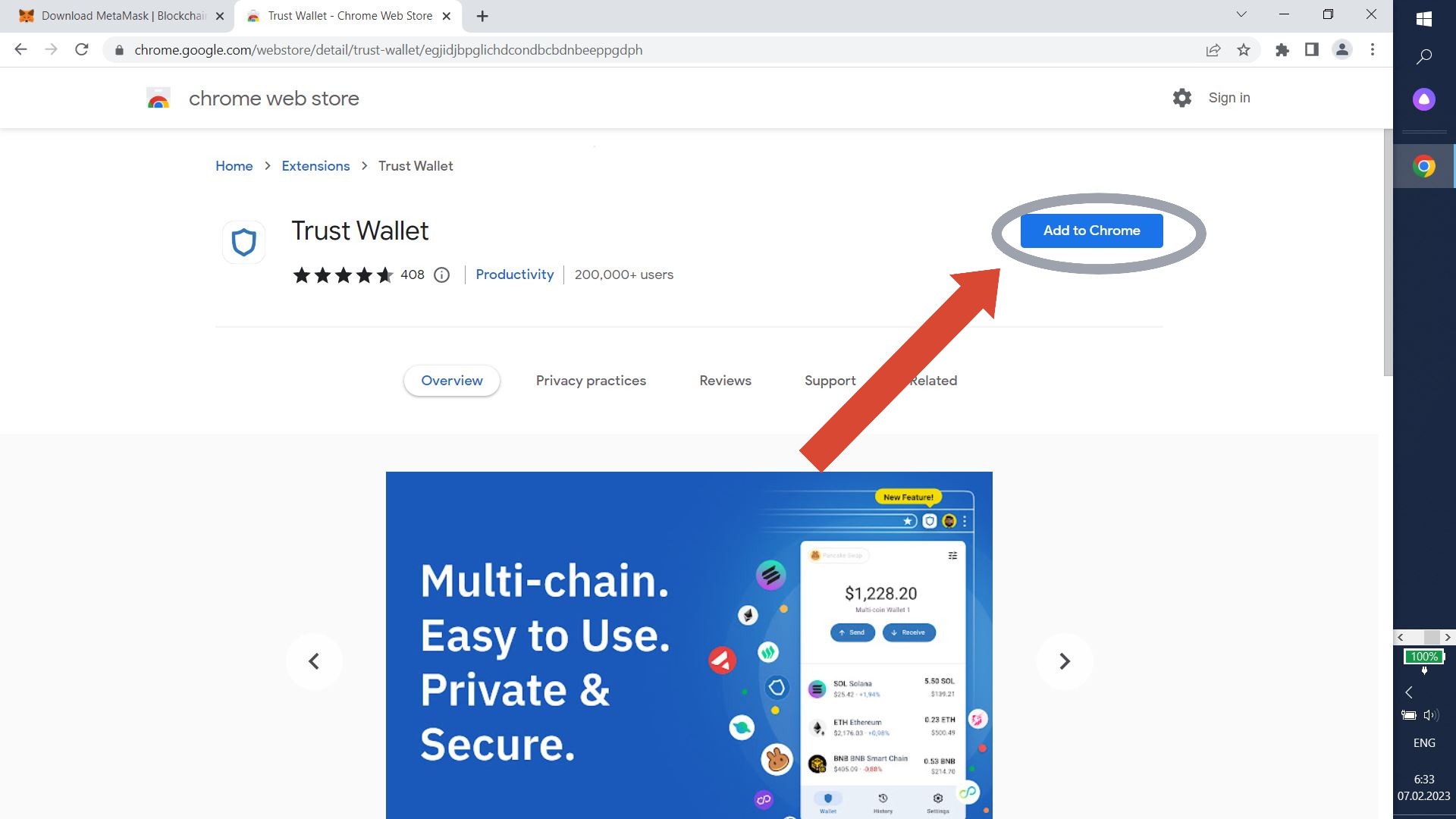 Let's install Trust Wallet. Click "Add to Chrome".