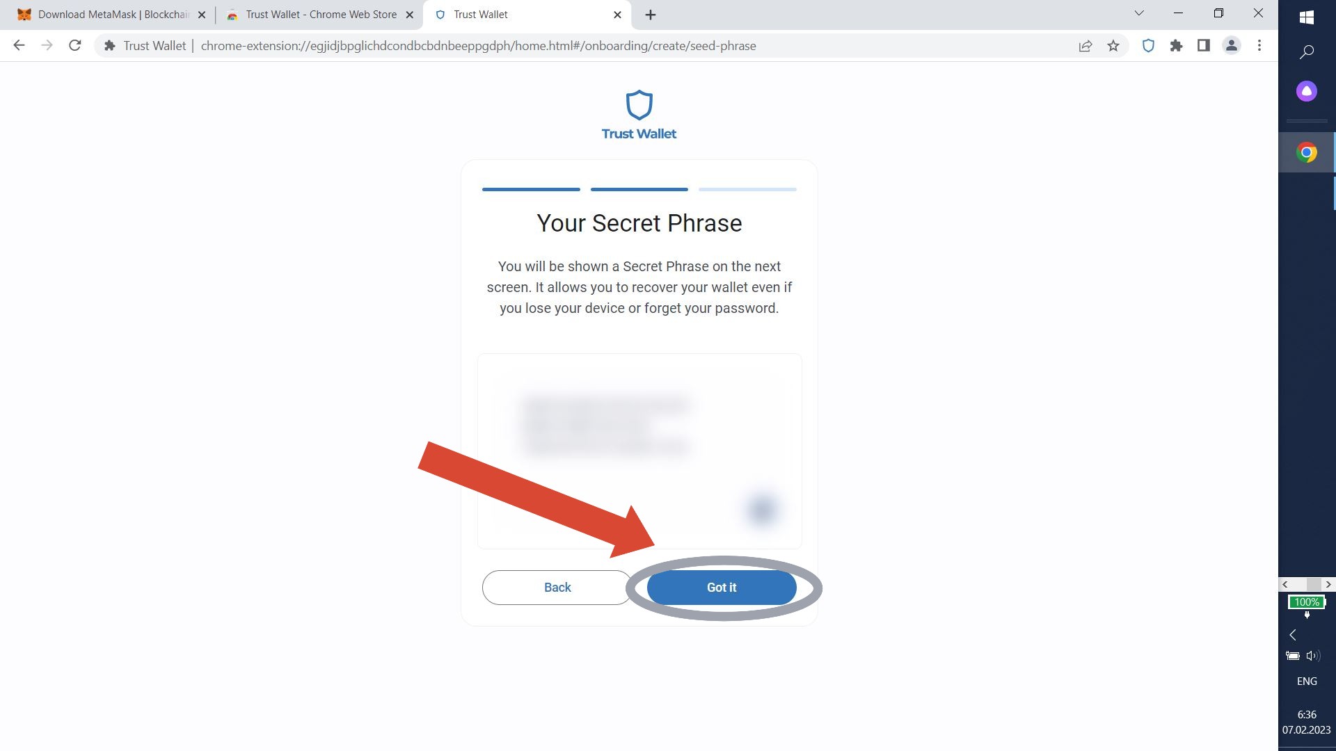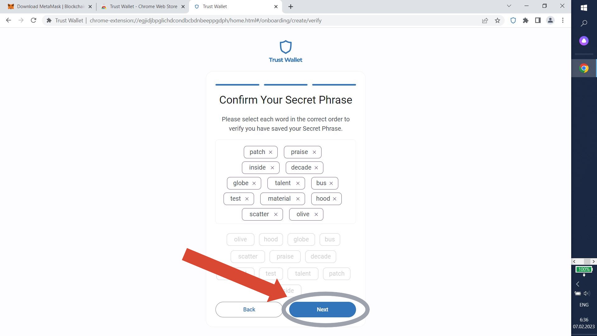 Enter your secret phrase. If you did everything correctly the button "Next" will turn blue. Click it.