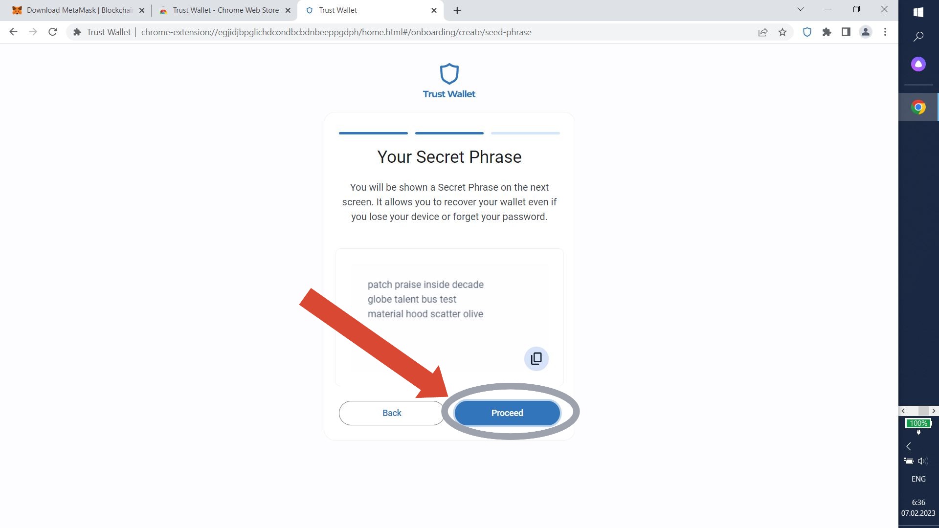Write down your secret phrase and click "Proceed".