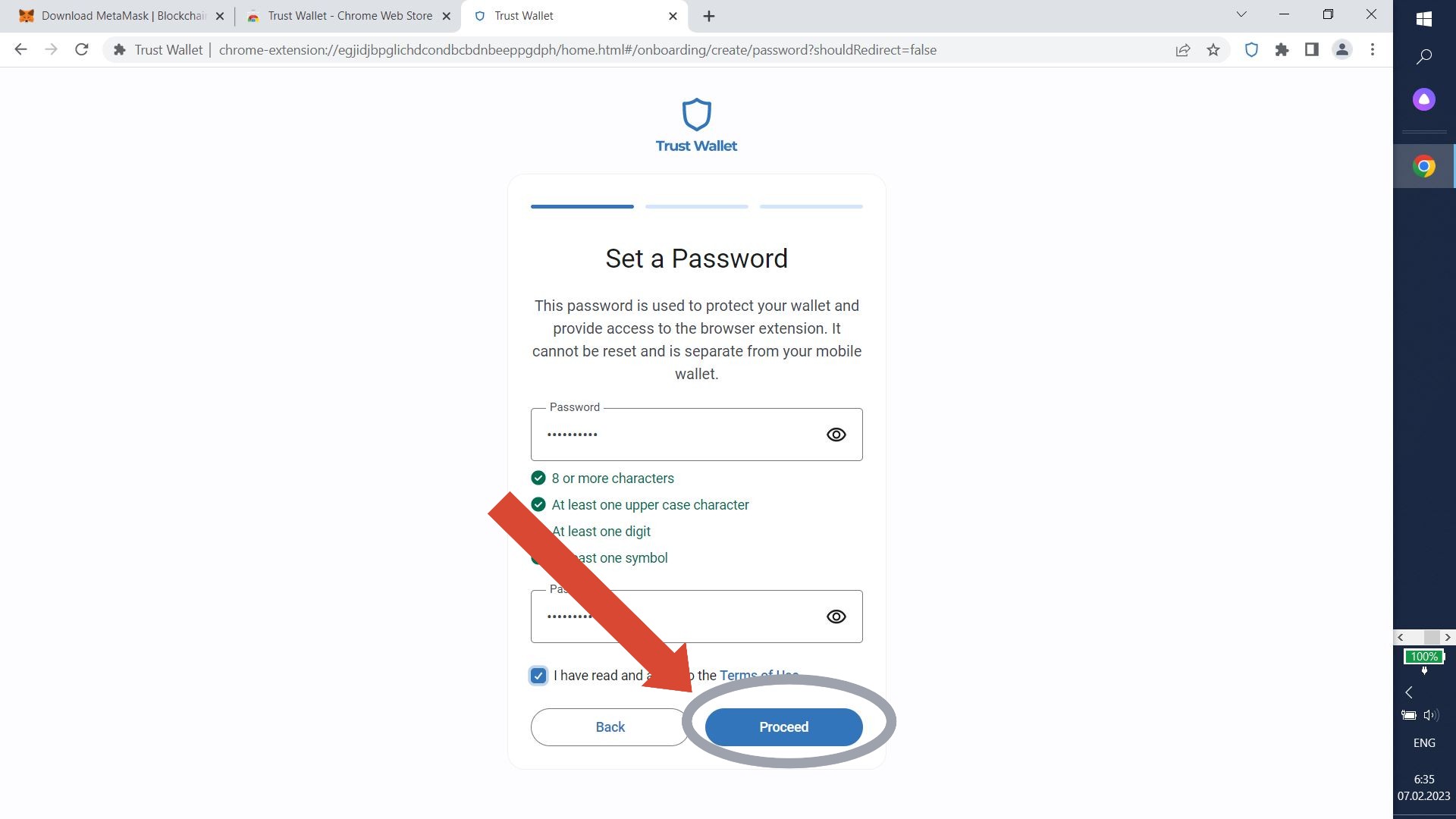 Create a strong password. Enter it twice, tick "I have read and agree..." and click "Proceed".